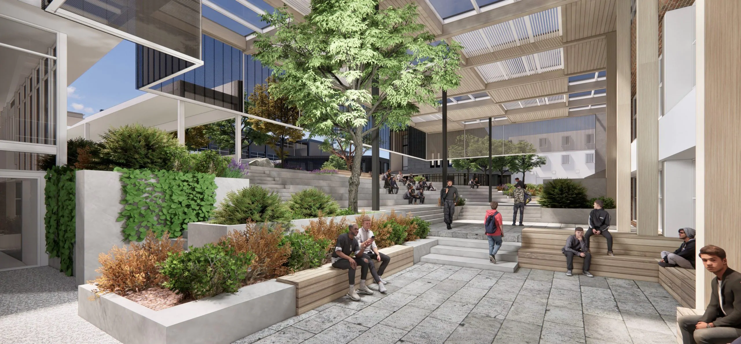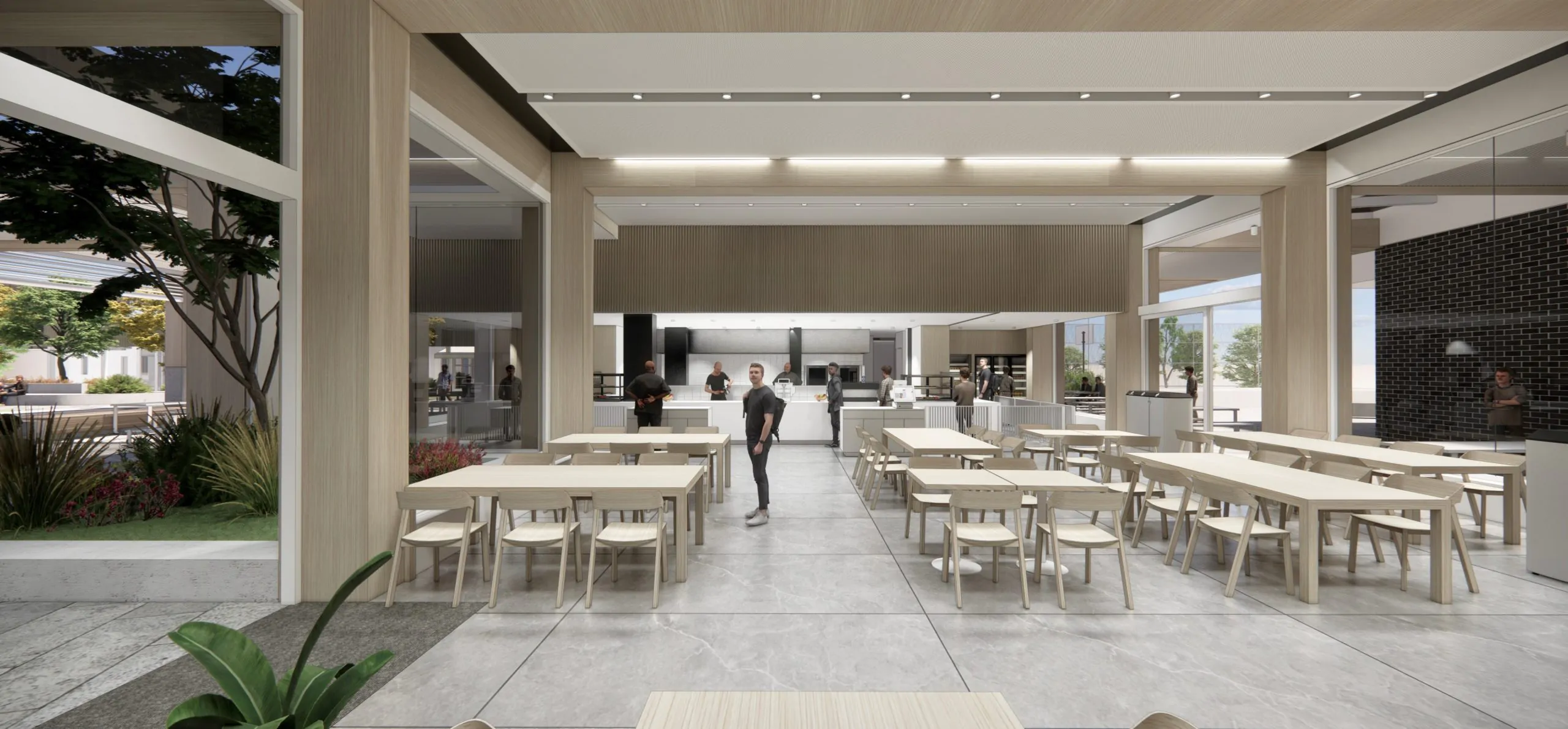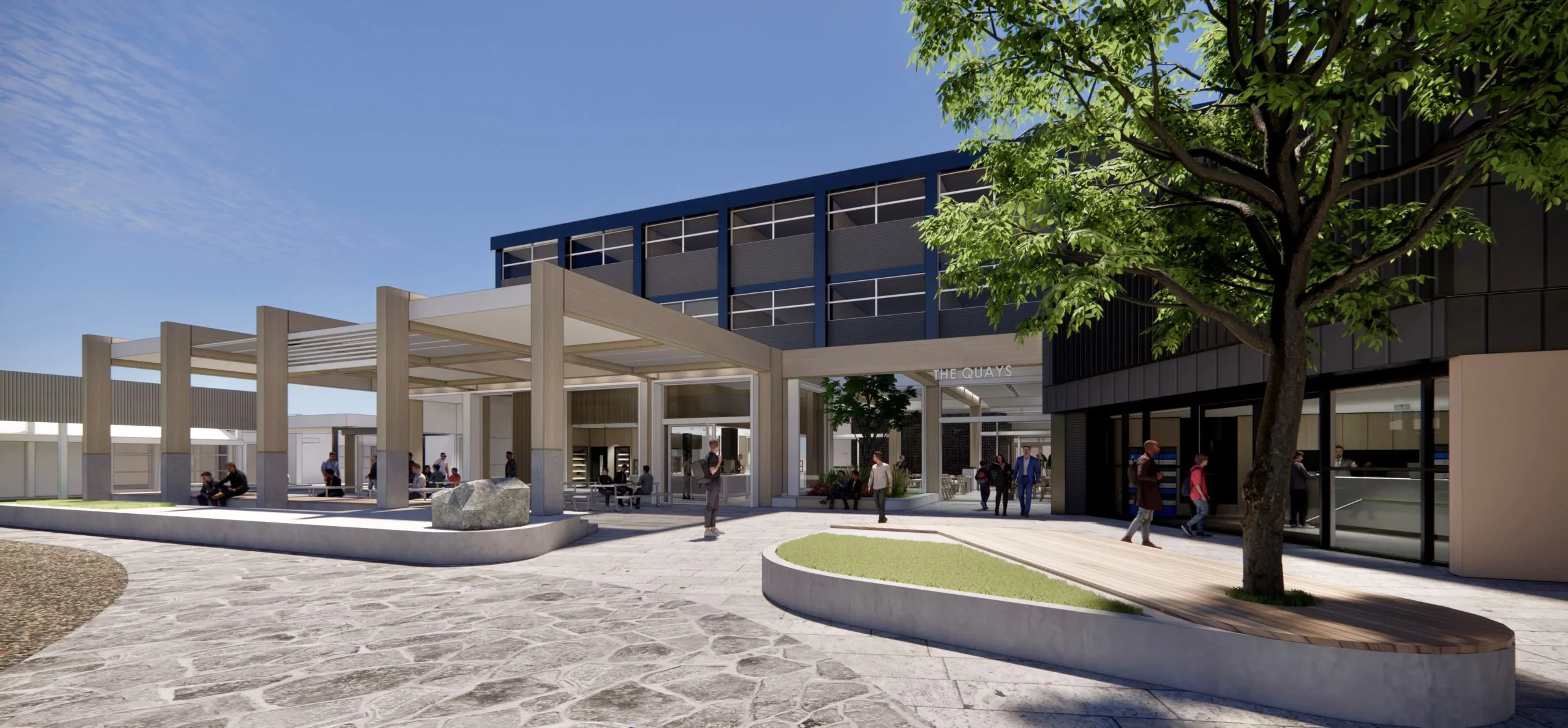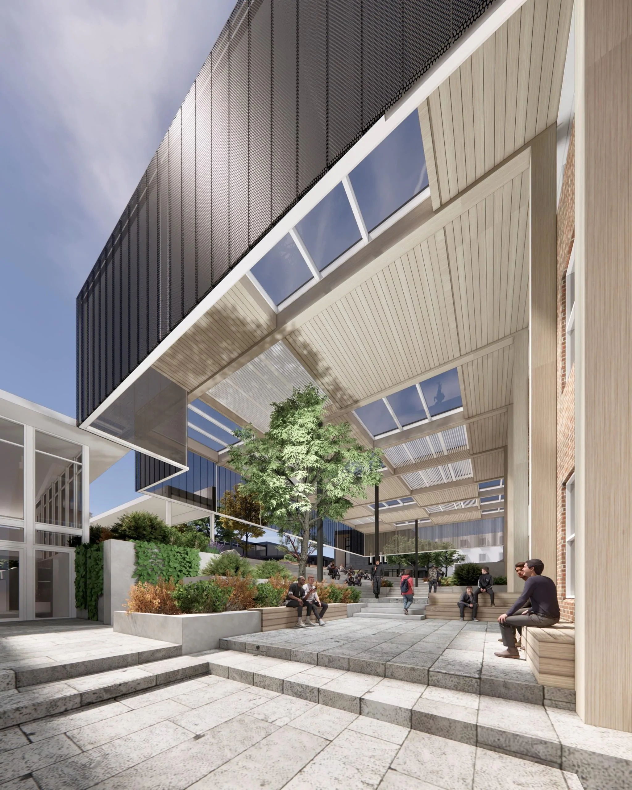 This project unfolds with the vision of crafting a vibrant Commons area for students, thoughtfully positioned in proximity to the new Student study zone and Canteen. Seamlessly integrated into the campus layout, these spaces are strategically designed for easy accessibility from multiple points, with large openings that facilitate a seamless flow of connectivity and an abundance of natural daylight. In harmony, they form a dynamic nexus for the campus community, fostering collaboration and enriching the overall student experience. The piazza stands as the vibrant nucleus of the College, shaping its new beating heart. This meticulously designed space serves as the paramount gathering point, where students, staff, and visitors converge to connect, interact, and unwind. Seamlessly linking vital segments of the College, the design draws inspiration from the traditional yarning circle and thoughtfully weaves in elements of a riverbed, paying homage to indigenous heritage and its profound connection to Steel Creek. In its form and function, this architectural design encapsulates the essence of community, culture, and place.